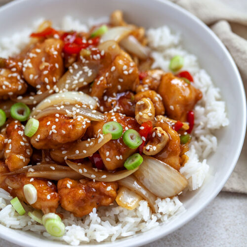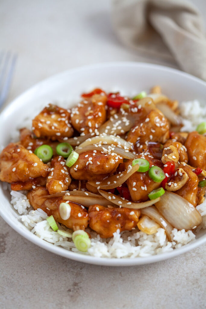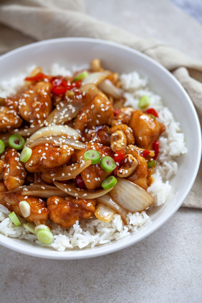 - Strooi de sesamzaadjes over de kip en voeg de cashewnoten toe.