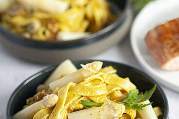 - Verhit wat olijfolie in een pan en fruit de ui, knoflook en gember zachtjes op laag vuur.