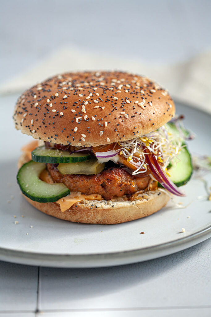 Maak een luxe hamburger met sappige kipburgers, cheddarkaas, knapperige groenten, en mosterd-mayo op verse broodjes. Simpel en heerlijk!