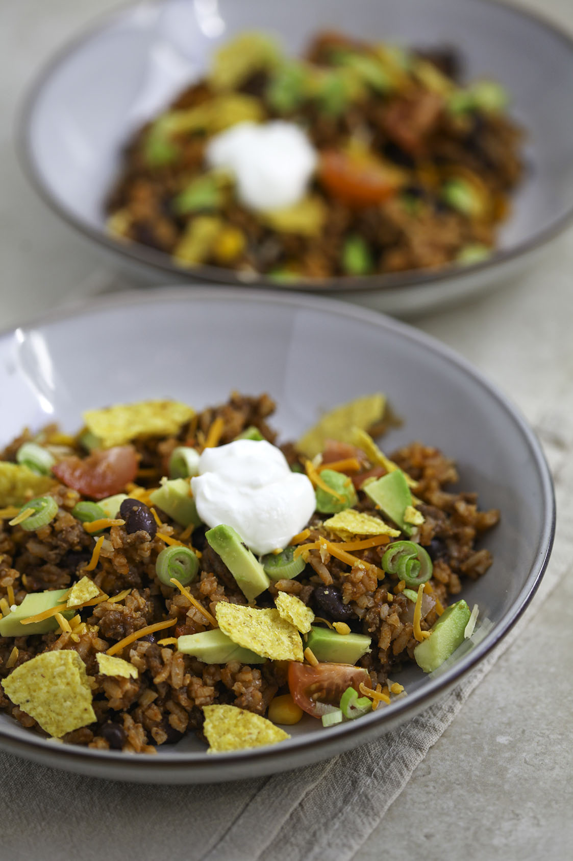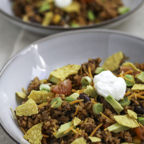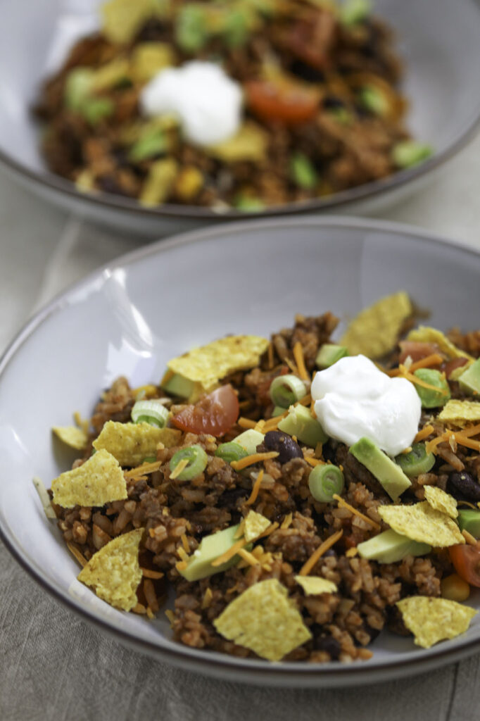 Een heerlijke burritobowl vol smaak en perfect comfortfood. Met kruidig rundergehakt, rijst, bonen, maïs en lekkere toppings zoals nacho’s, avocado en zure room. Makkelijk, snel en alles gewoon uit één pan.