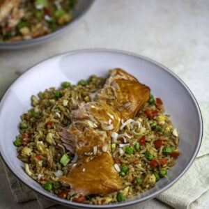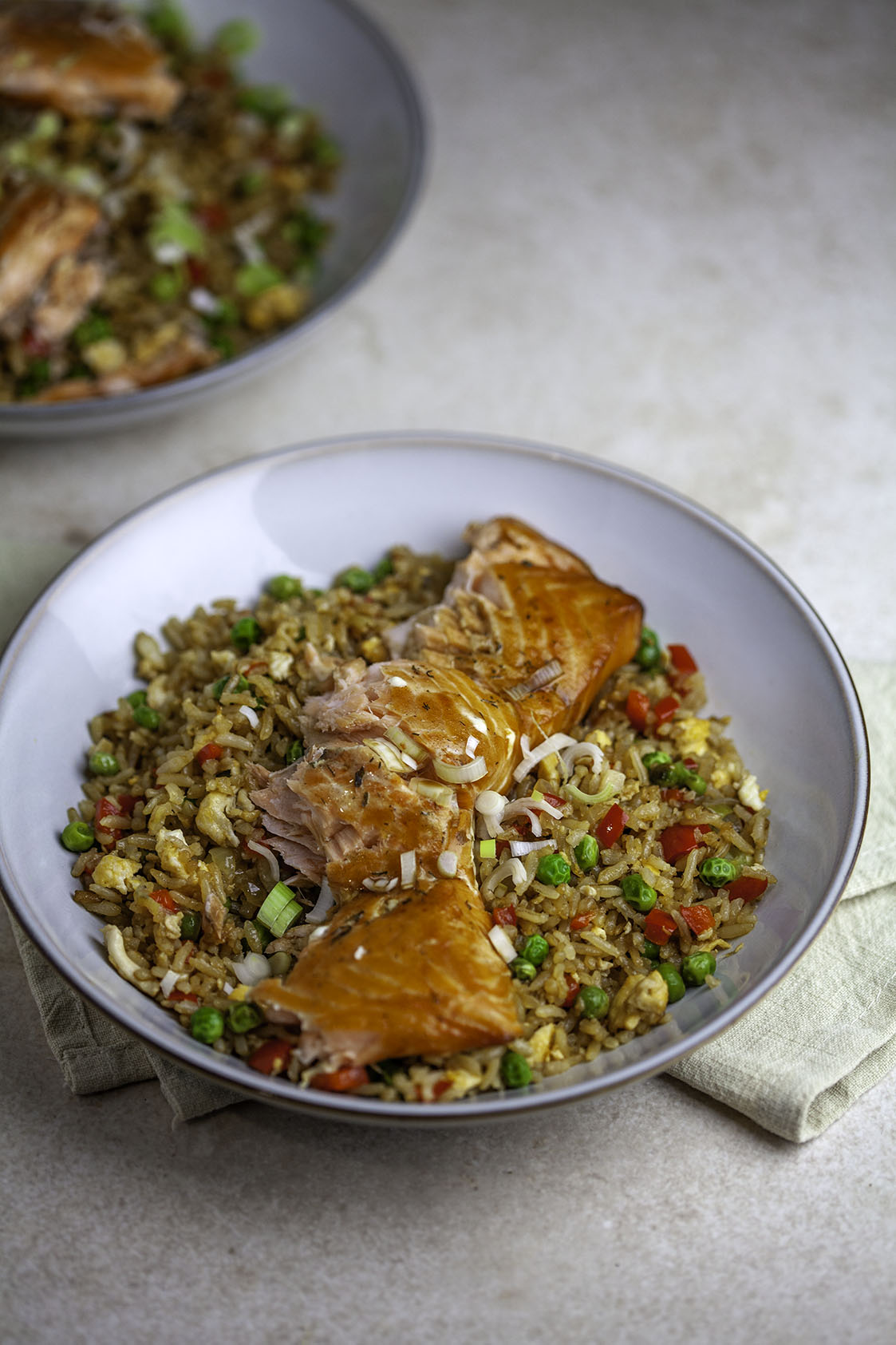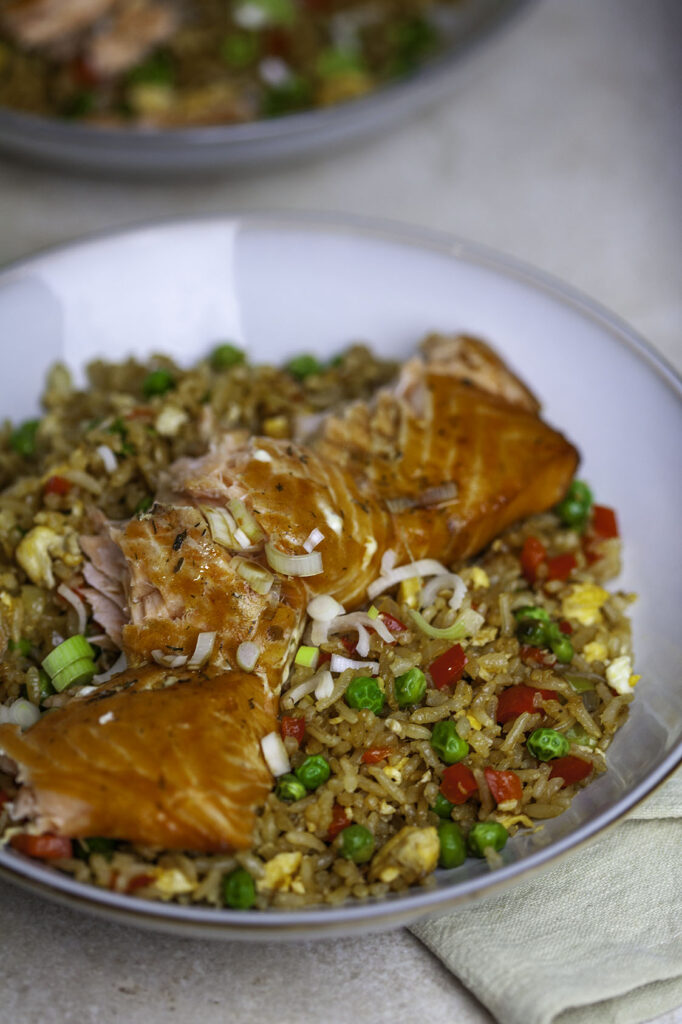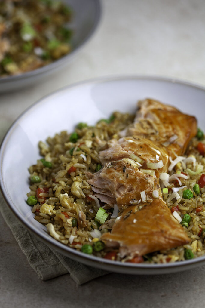 Een snel en simpel gerecht voor 2! Zalm, knapperige groenten en gebakken rijst met ei, sojasaus en sesamolie. Binnen 30 minuten op tafel, lekker en gezond!