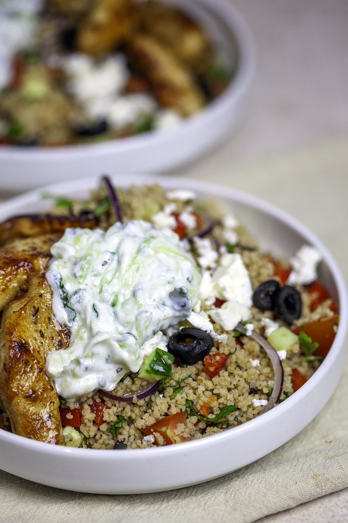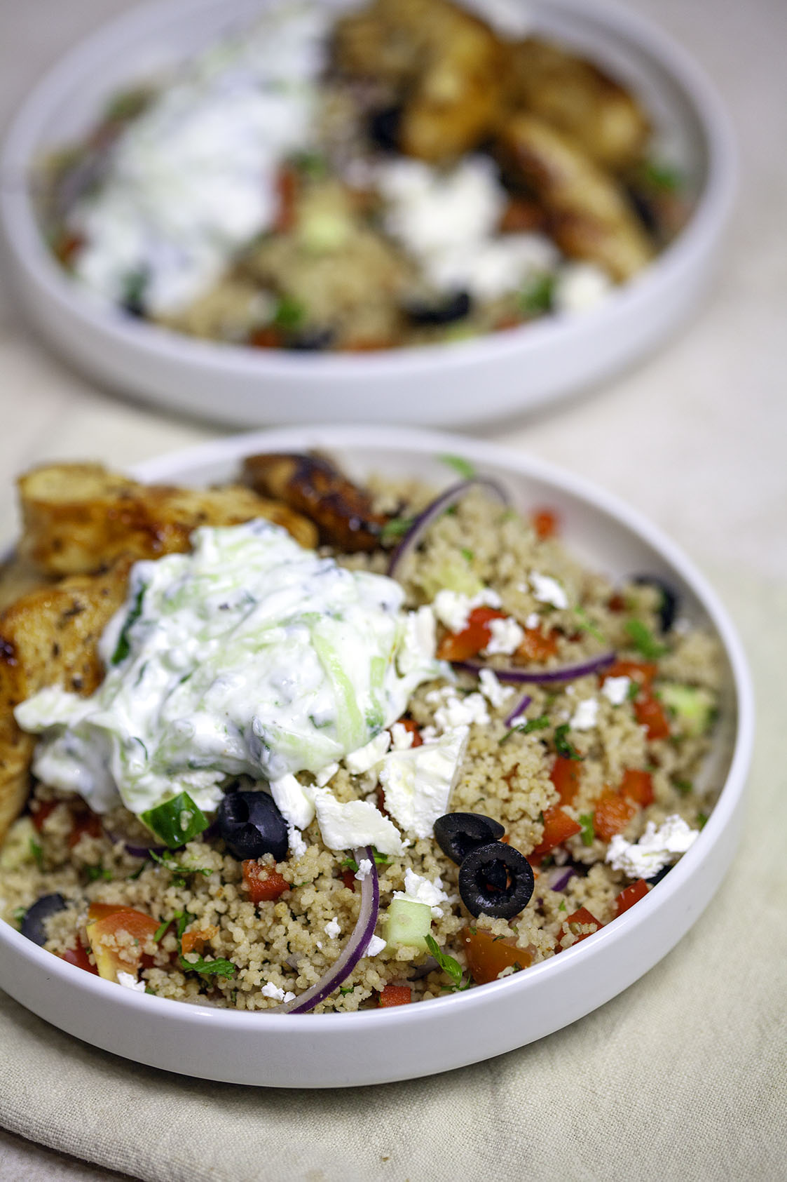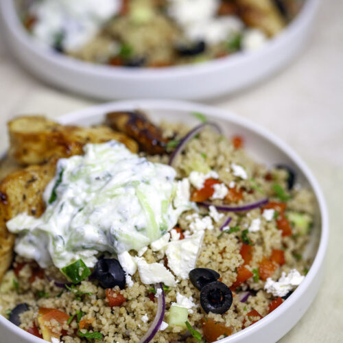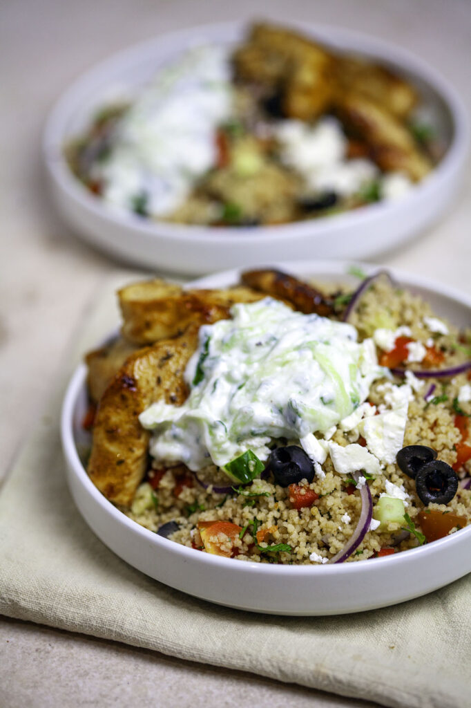 Haal de smaken van Griekenland in huis met deze heerlijke couscoussalade met verse groenten, kip en feta. Snel en eenvoudig te maken!