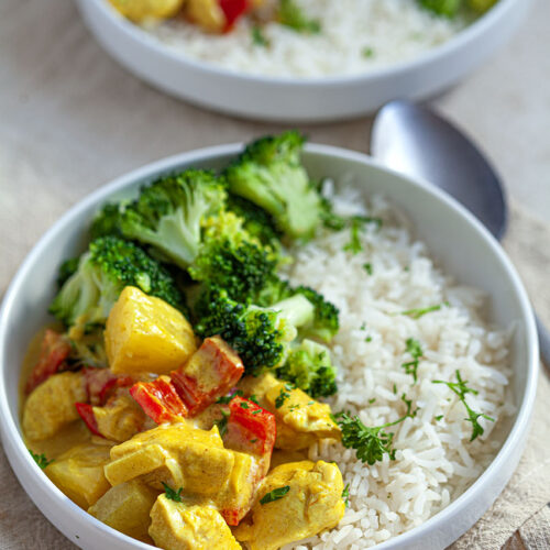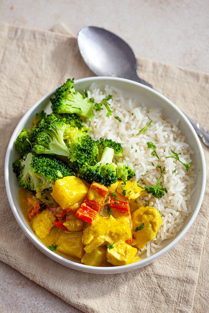 Dit eenvoudige gerecht, kip kerrie met broccoli en ananas, is een smaakvolle combinatie van zachte, romige kokosmelk en kruidige kerrie. De broccoli biedt een heerlijke knapperigheid, en de ananas brengt een zoete, verfrissende twist.