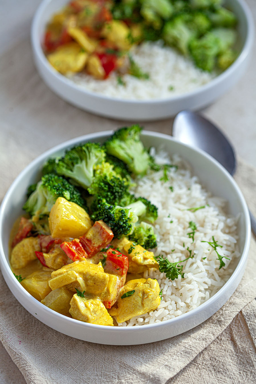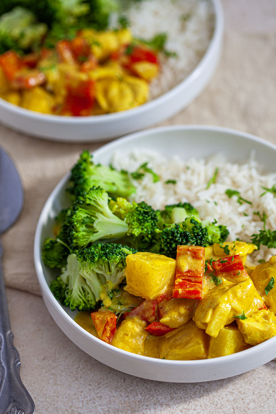 Dit eenvoudige gerecht, kip kerrie met broccoli en ananas, is een smaakvolle combinatie van zachte, romige kokosmelk en kruidige kerrie. De broccoli biedt een heerlijke knapperigheid, en de ananas brengt een zoete, verfrissende twist.