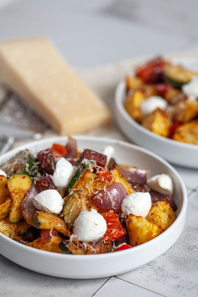 Deze heerlijke Italiaanse aardappelschotel met groenten, salami, mozzarella en Parmezaanse kaas is snel en eenvoudig te maken.