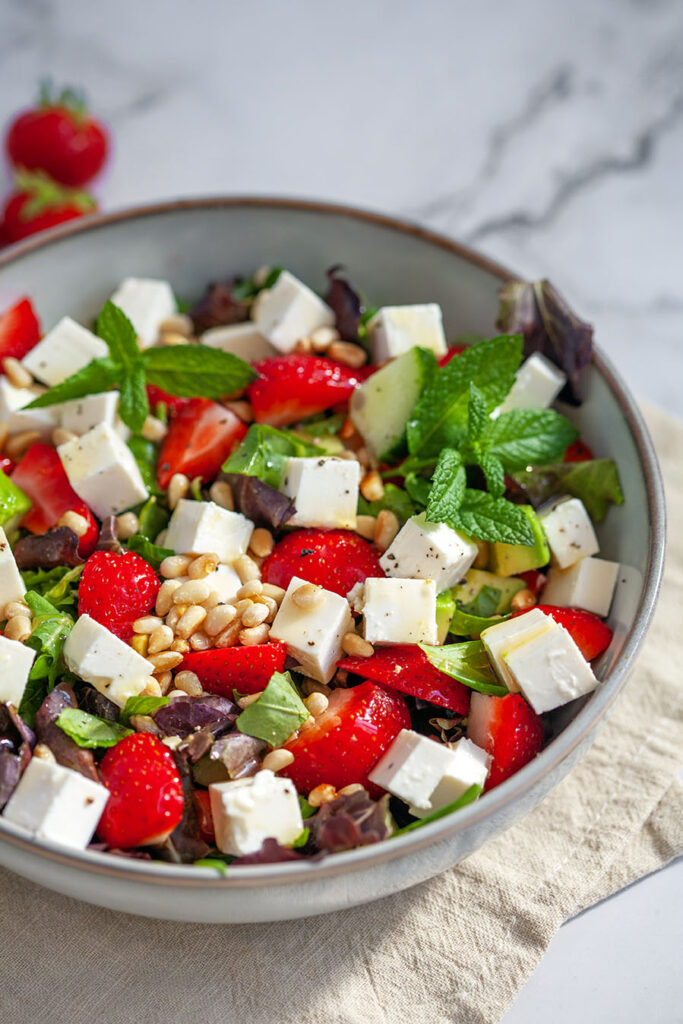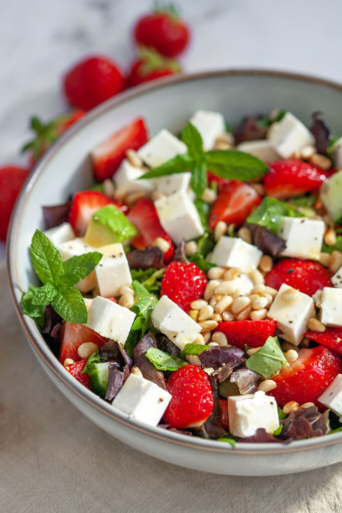 Deze simpele salade is een makkelijke mix van avocado, aardbeien, en feta. Voeg rucola en pijnboompitten toe voor wat extra smaak. Meng alles met een honing-citroendressing en je hebt in een paar minuten een lekker lunch of een bijgerecht.