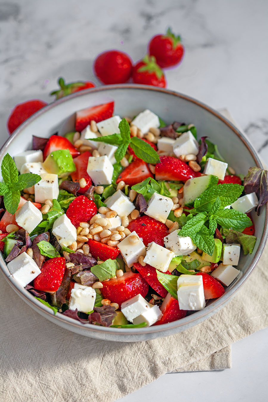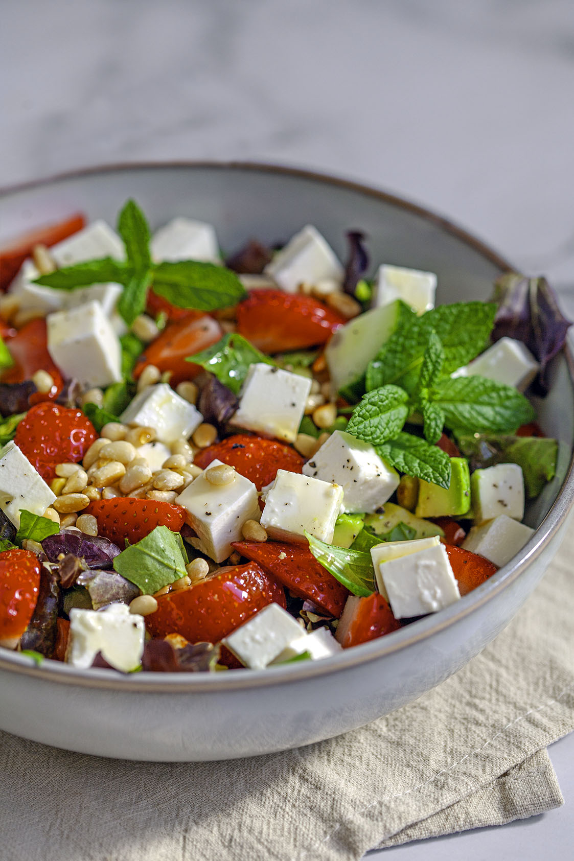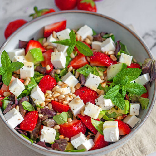 Deze simpele salade is een makkelijke mix van avocado, aardbeien, en feta. Voeg rucola en pijnboompitten toe voor wat extra smaak. Meng alles met een honing-citroendressing en je hebt in een paar minuten een lekker lunch of een bijgerecht.